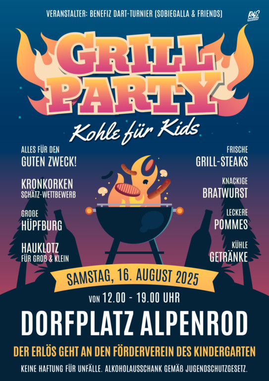 Am Samstag, 16. August 2025, findet von 12.00 bis 19.00 Uhr die große Benefiz-Grillparty „Kohle für Kids“ auf dem Dorfplatz Alpenrod statt. Der Erlös der Veranstaltung kommt dem Förderverein des Kindergartens zugute.
