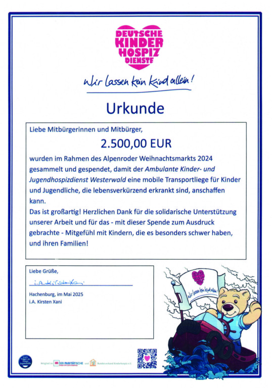 Mit großer Wertschätzung hat sich der Förderverein Kinderhospizarbeit Westerwald e. V. bei der Ortsgemeinde Alpenrod für die Spende über 2.500 € bedankt. Der Betrag wurde durch die Mitwirkenden und Besucherinnen und Besucher des Alpenroder Weihnachtsmarkts 2024 gesammelt und kommt dem Ambulanten Kinder- und Jugendhospizdienst Westerwald zugute.
