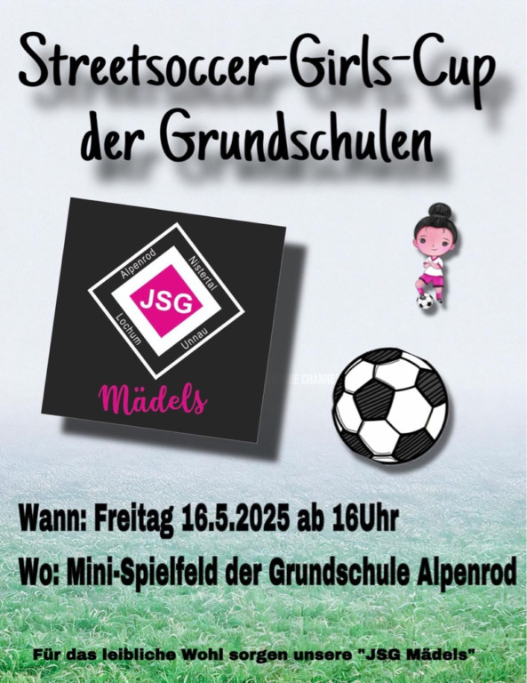 Am Freitag, 16. Mai 2025, ab 16.00 Uhr laden die Grundschule Alpenrod und die JSG Alpenrod herzlich zum Street Soccer Cup ein. Acht Teams mit je fünf Spielerinnen treten auf dem Mini-Spielfeld in spannenden Spielen gegeneinander an. Fairplay, Teamgeist und Freude am Spiel stehen dabei im Vordergrund.