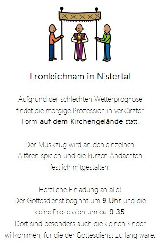 Wegen der schlechten Wetterprognose wird die Fronleichnamsprozession in Nistertal in diesem Jahr nicht im üblichen Rahmen durchgeführt. Stattdessen findet sie in verkürzter Form auf dem Kirchengelände statt.