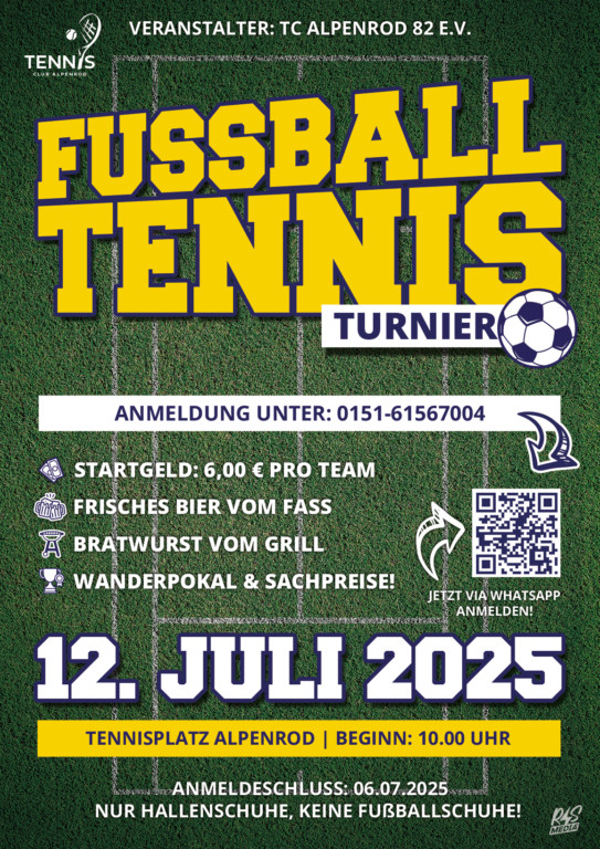 Der TC Alpenrod 82 e. V. lädt herzlich zum Fußballtennis-Turnier am Samstag, den 12. Juli 2025, auf dem Tennisplatz in Alpenrod ein. Beginn ist um 10:00 Uhr.
