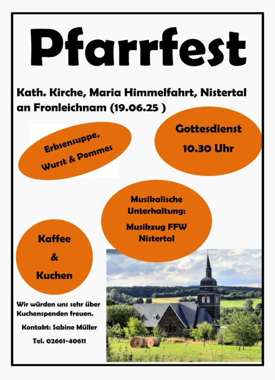 Die katholische Kirchengemeinde Maria Himmelfahrt Nistertal lädt herzlich zum diesjährigen Pfarrfest an Fronleichnam, Donnerstag, den 19. Juni 2025, ein.