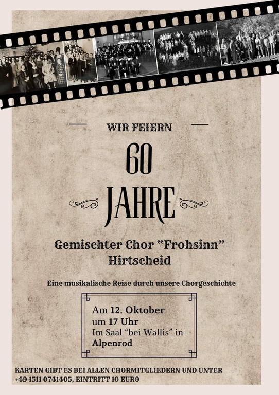 Am kommenden Sonntag den 12. Oktober ist es so weit. Der Gem. Chor „Frohsinn“ Hirtscheid feiert seinen 60. Geburtstag. Wie es sich für einen Chor gehört, wird dies in Form eines Konzertes sein, das im Saal im Gasthaus Walli’s in Alpenrod stattfindet.