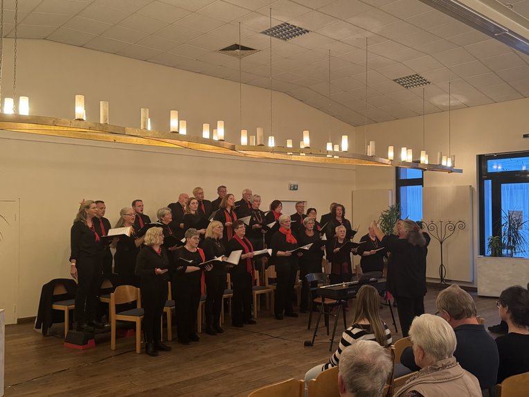 Die Feier begann mit der Begrüßung durch die 1. Vorsitzende Katharina Kühn. Anschließend führte Chorleiterin Edda Sevenich gut gelaunt durch die Geschichte und Geschichten des Chores. Die Schar aus 27 Sängern eröffnete den Reigen mit „Good News“. Das musikalische Spektrum des Chores spannte sich dabei weit: Es reichte von Liedern zum Lobe Gottes wie „The Lord bless you and keep you“ und traditionellen Volksliedern wie dem „Lindenbaum“ bis hin zu kontrastreichen Werken wie dem opernhaften „Giulietta di Verona“ oder dem Elvis-Klassiker „Can’t help falling in love“. Die geschulten Stimmen zeigten eindrücklich, dass sie lange Atembögen und Phrasen führen vermögen.