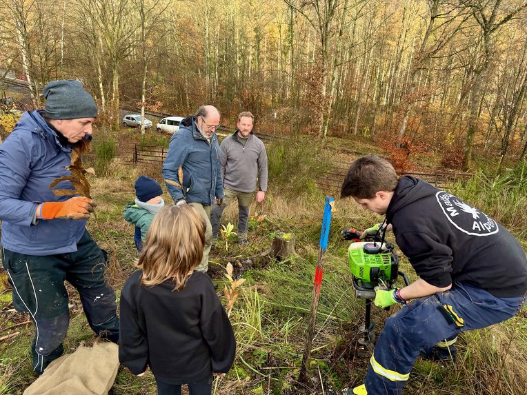 Ein großer Dank gilt wie immer unserer Feuerwehr und der Jugendfeuerwehr, die seit der ersten Pflanzaktion tatkräftig mithelfen. Die Ortsgemeinde unterstützte die Helferinnen und Helfer, indem sie Bohrgeräte und Pflanzwerkzeug bereitstellte, die die Arbeit deutlich erleichterten, sowie Getränke während der Pflanzaktion. Zum Abschluss gab es wie die Jahre zuvor auch einen stärkenden Mittagsimbiss.