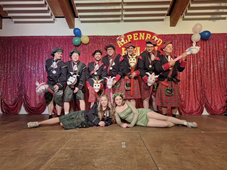 Das Männerballett „Granitgranaten“ sorgte für einen furiosen Abschluss: die Tänzer wirbelten in Cowboys- und Schotten-Kostümen über die Bühne und rissen den Saal mit. Während der Umziehpause überbrückte Trainerin Lena mit einem schottischen Dudelsack-Vortrag und schuf eine besondere Atmosphäre. Im großen Finale versammelten sich alle Aktiven noch einmal gemeinsam auf der Bühne, bevor eine lange Polonaise durch die Humorarena zog und Aktive wie Gäste vereinte.