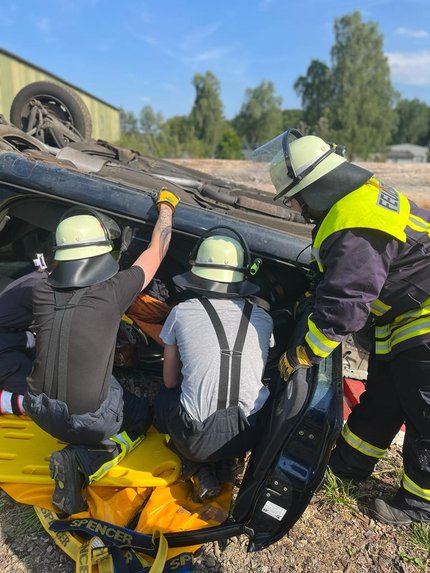 Der zweite Einsatzbefehl lautete: Rettung einer einklemmten Person nach Auto-/Verkehrsunfall. Hier unterstützten zwei Malteser-Sanitäterinnen, welche zusätzlich hilfreiche Tipps zur Verletztenrettung und -betreuung an der Unfallstelle mitgaben. Die Verständigung der beiden Gruppen untereinander funktionierte sehr gut und alle Szenarien wurden gemeinsam und mit viel Spaß angegangen.