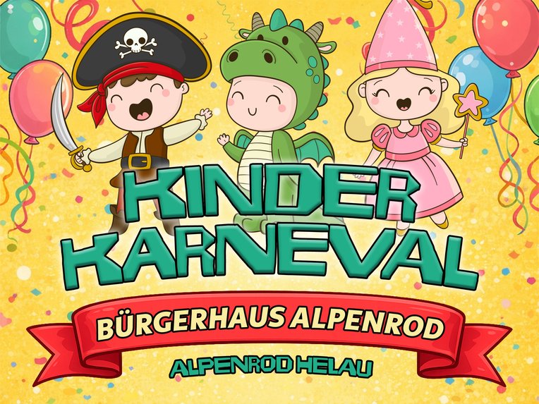 Am Rosenmontag, den 16. Februar 2026, lädt der Kinderkarneval im Bürgerhaus Alpenrod alle kleinen und großen Narren zu einem fröhlichen, bunten Nachmittag ein. Nach den Rosenmontagszügen in der Umgebung bietet der Kinderkarneval einen tollen Abschluss des närrischen Tages für die ganze Familie.
