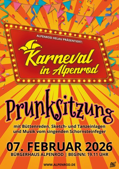 Am Samstag, den 07. Februar 2026, öffnet das Bürgerhaus Alpenrod seine Türen für einen närrischen Abend voller Karneval, Humor und guter Unterhaltung.